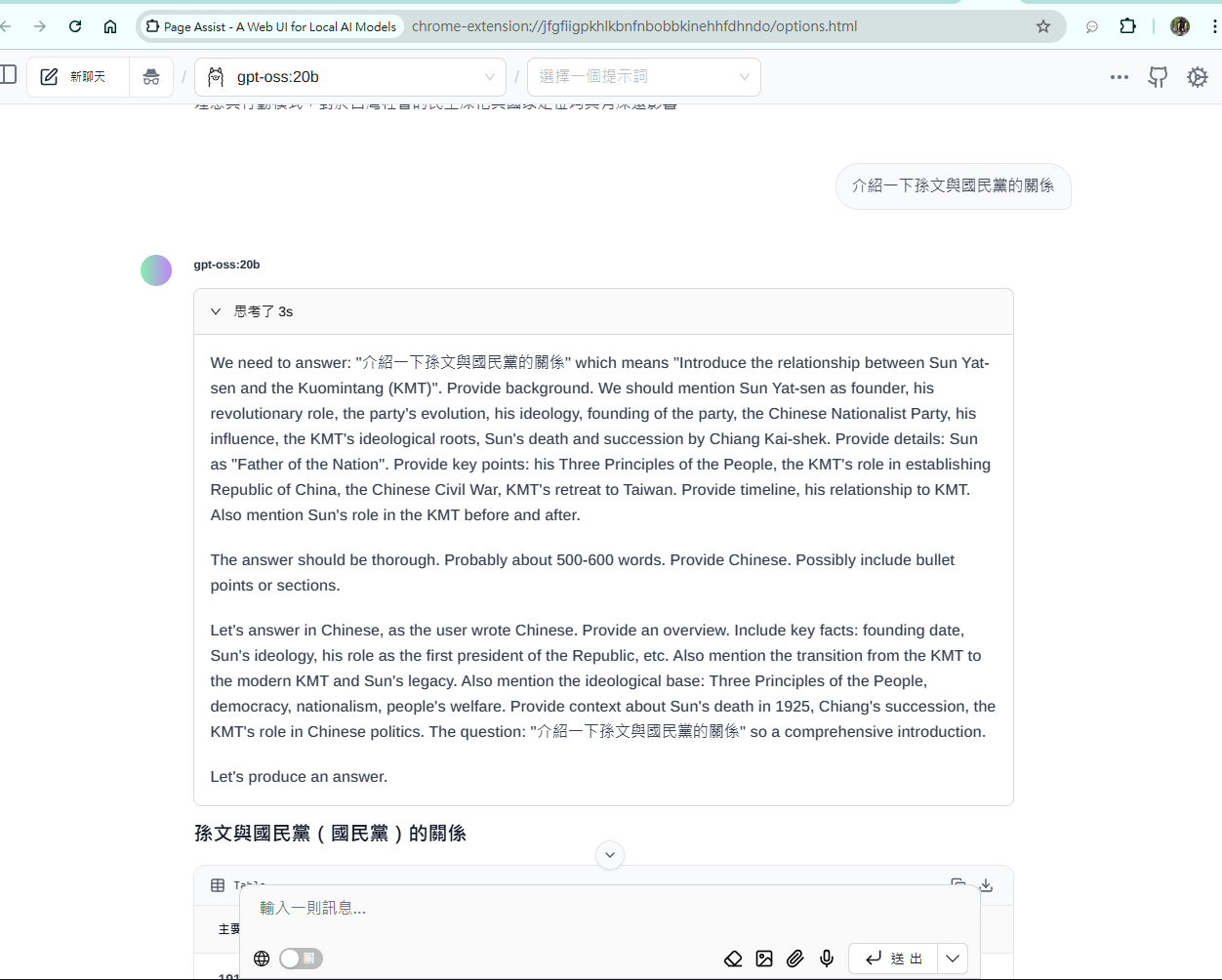 - 因為擴充功能(插件)會占用不少記憶體,即使經過安裝與設定,一般瀏覽器設定是選擇不開啟的。每次開啟瀏覽器後,還是需要再次啟動Page Assist👩💼喚醒其功能。